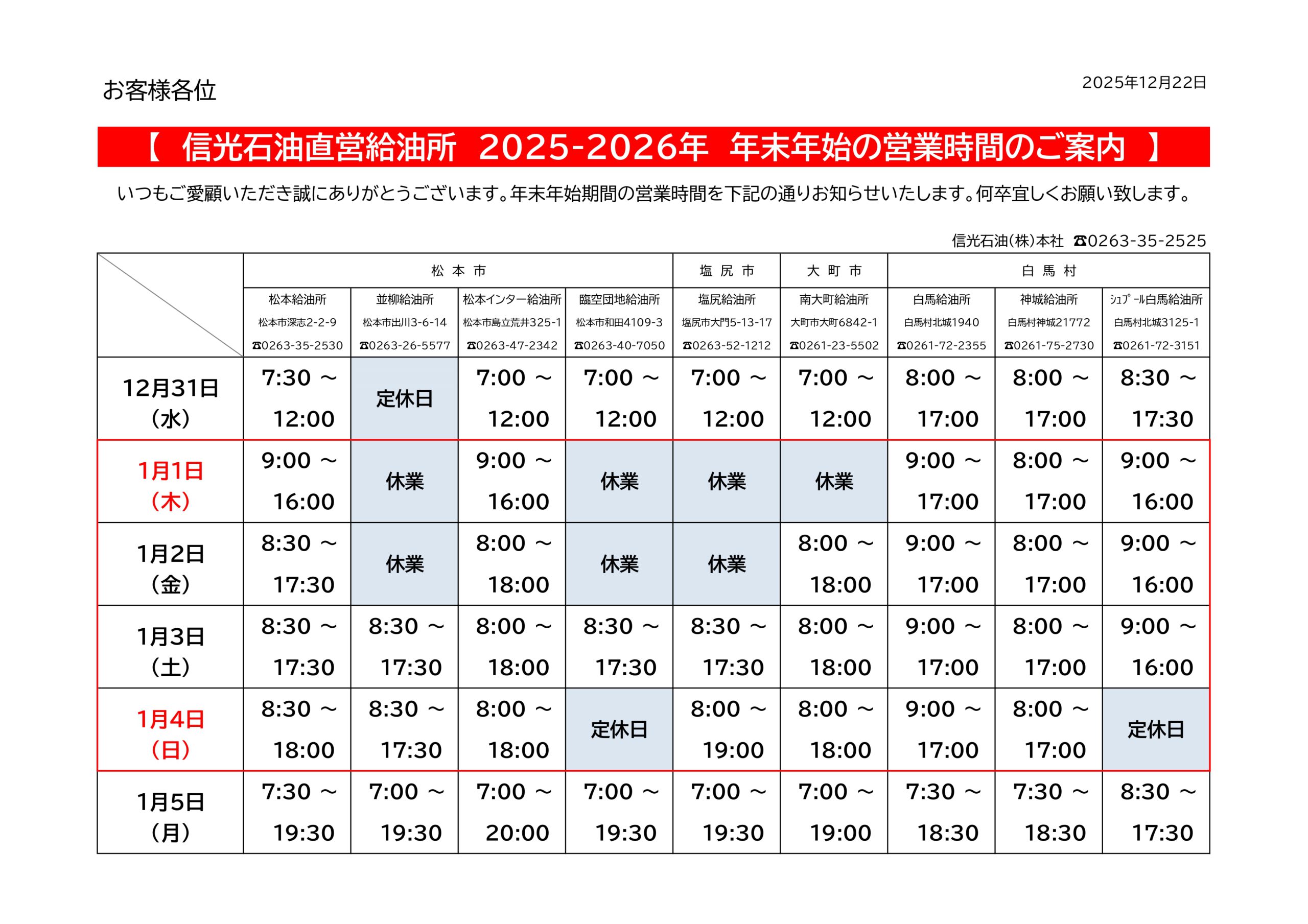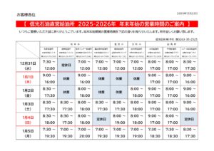 2025年年末から2026年年始にかけての弊社SSの営業予定時間です。